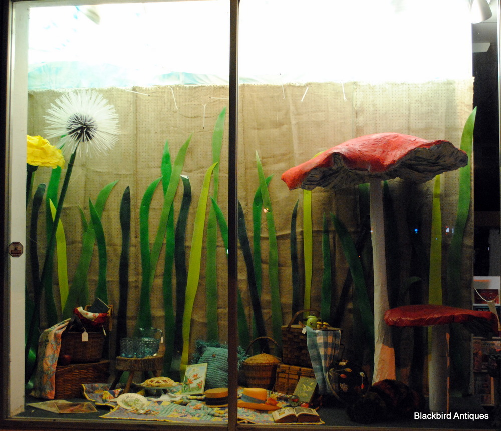 In our window world, we imagined that someone would want to picnic under a giant mushroom, so we merchandised with springy, picnic themed items.  A vintage quilt in yellow and turquoise, combined with turquoise glassware, stacks of picnic baskets, and insect themed finds completed our dream.